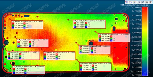 国际知名智能终端制造商,希望提升手机中板的平面度测量精度,检测中板上是否存在上凸及(或)下凹缺陷,从而避免手机中板平面度过差而影响后续工艺手机组装环节,我司提供的平面度测量解决方案,完全满足其测量需求:上凸界限值为0.05mm,下凹界限值为 -0.25mm。