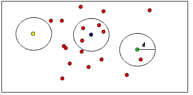 (假设红色为邻域点,半径d为邻域距离阈值)