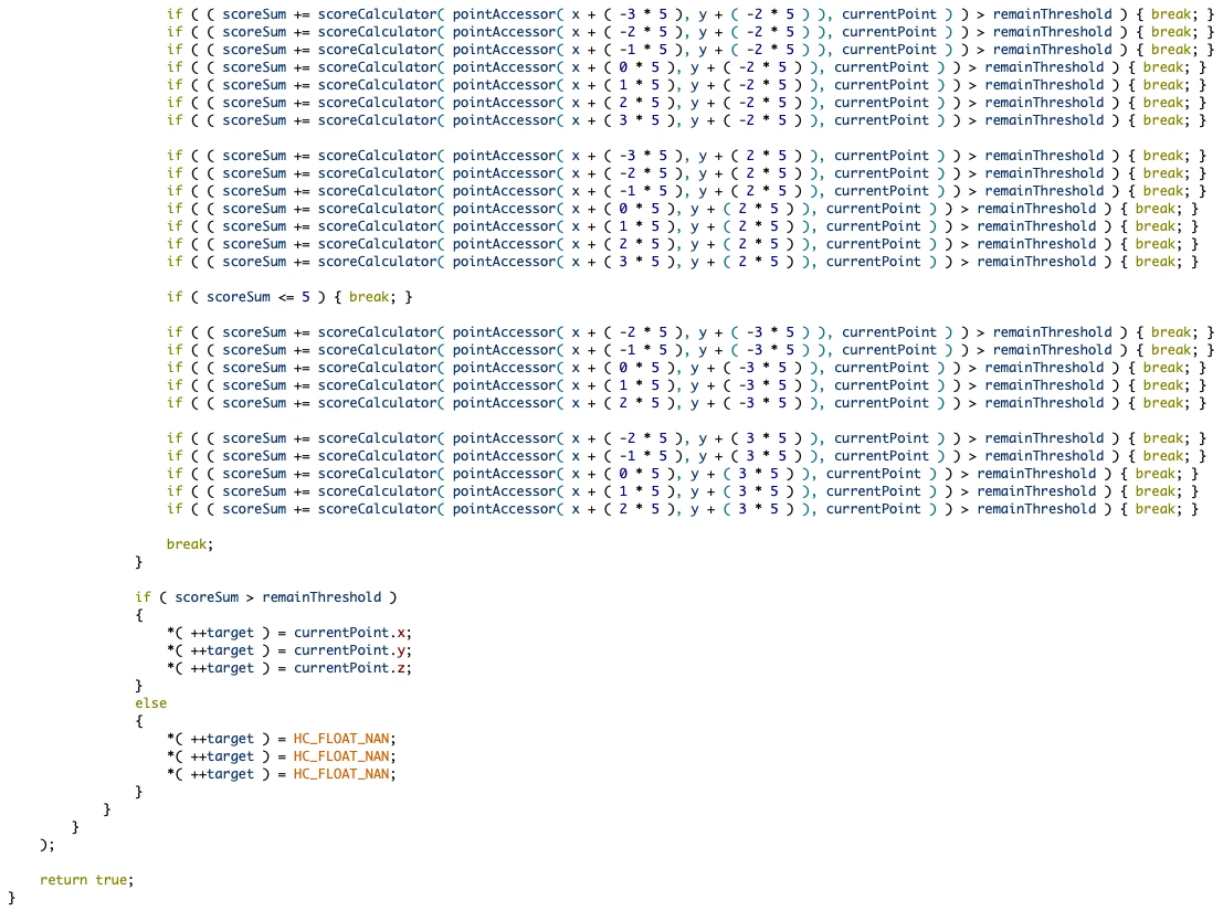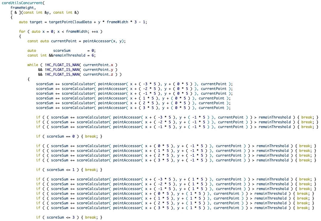 即代码循环体内最大代码量部分。算法中邻域搜索逻辑是会先从点云当前行开始,依次搜索-1行,+1行,-2行,+2行,-3行,+3行。结合物理世界中实际点云噪点分布情况,如果在当前行和-1行都没有搜索到符合条件的邻域有效点,那么在+1,-2行这些也大概率搜索不到邻域有效点,因此当前点基本就是无效点,就可以直接删除。按照此逻辑类推,分别设置1、3、5个邻域有效点的退出条件。通过此项剪枝后,可以提速2到4倍。