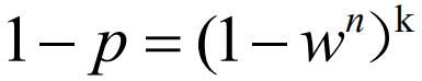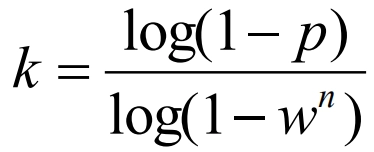 我们不得不根据特定的问题和数据集,通过实验来确定参数t和N。然而参数k(迭代次数)可以从理论结果推断。当我们在估计模型参数时,用p表示一些迭代过程中从数据集内随机选取出的点均为局内点的概率;此时,结果模型很可能有用,因此p也表征了算法产生有用结果的概率。用w表示每次从数据集中选取一个局内点的概率,如下式所示: