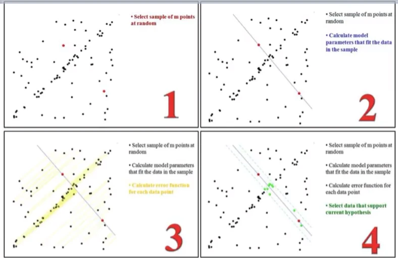 RANSAC算法的基本假设是样本中包含正确数据(inliers,可以被模型描述的数据),也包含异常数据(outlies,偏离正常范围很远、无法适应数学模型的数据),即数据集中含有噪声。这些异常数据可能是由于错误的测量、错误的假设、错误的计算等产生的。同时RANSAC也假设,给定一组正确的数据,存在可以计算出符合这些数据的模型参数的方法。