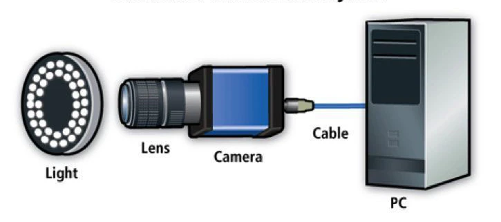 基于PC视觉系统(PC-Based)一般由若干光学镜头、相机(CMOS/CCD)、光源(3D结构光发生器等),图像传输数据线,图像采集卡(网卡,IO板卡等)以及PC和图像处理软件等构成。以经典2D视觉系统示例如下: