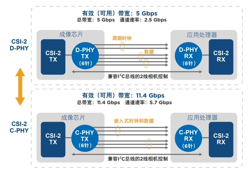 MIPI CSI-2规范中描述了信号传输(D-PHY或C-PHY)的物理层以及用于图像数据传输的协议,该协议是以CSI-2为基础。该标准还指定了一种基于I²C总线的相机配置接口,即CCI(Camera Control Interface,相机控制接口)。