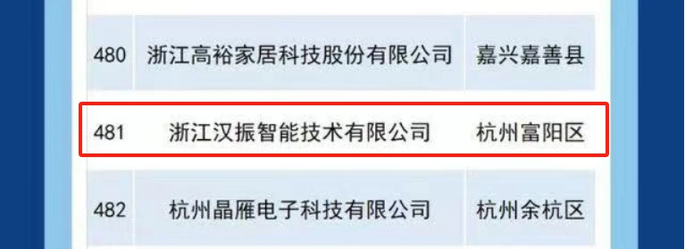 浙江汉振智能技术有限公司有幸入围,位列第481。
