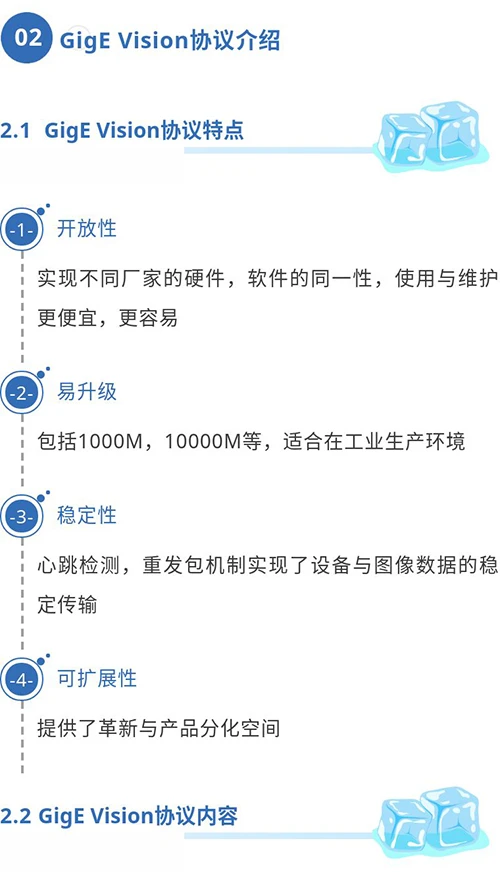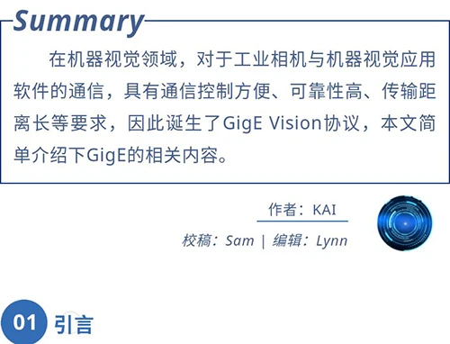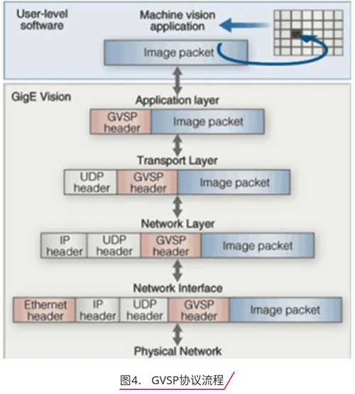 GigE Vision是由自动化影像协会AIA发起指定的一种基于千兆以太网的图像传输标准。在工业机器视觉产品的应用中,GigE Vision允许用户在很长距离用廉价的标准线缆进行快速图像传输。该标准基于UDP协议,应用层协议采用GVCP(GigE Vision控制协议)与GVSP(GigE Vision流传输协议),分别用来对相机进行配置和数据流的传输,解决了标准千兆网的两个问题,即传输效率低与CPU占用率过高,因此在工业相机领域得到了大范围的应用。