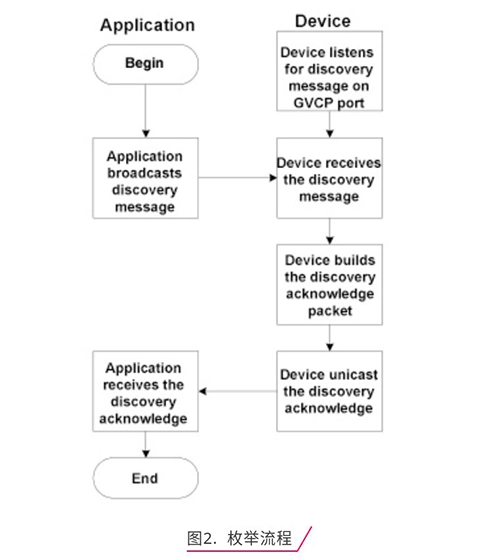 GigE Vision协议支持应用程序枚举网段内在线的相机,枚举流程如下: