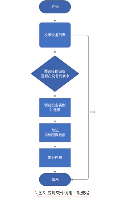 开始,枚举设备,然后根据自身的业务选择需要连接的相机设备,并连接。连接完成后可以执行取流操作,从设备中获取流数据。当完成工作后,执行断开连接,并释放相关资源。这样就完成了整个的调用。