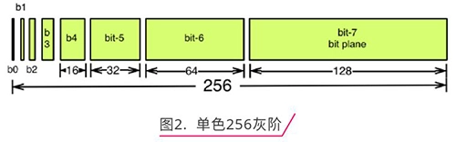 每个bit-plane的时隙长度用它与相应的2的幂来加权。这样就提供了图像的二进制脉冲宽度调制。在24-bit RGB流输入中,每个颜色时隙被分成8-bit平面。 在单颜色时隙中加权的所有bit的总和等于255(bit-plane由二进制表示加权)。如图2所示: