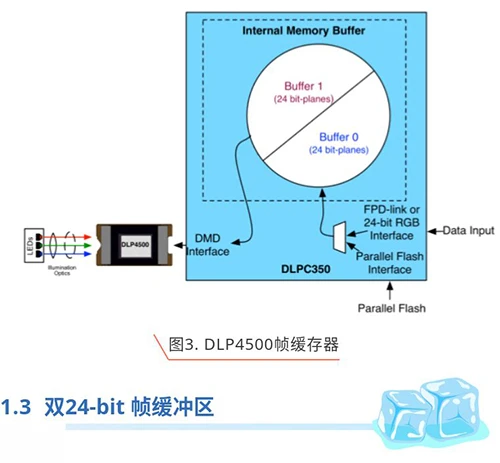 DLPC350可以在内部存储器缓冲区中存储两个24-bit帧。 这48 bit-plane显示缓冲区允许DLPC350向DMD阵列发送一个24-bit缓冲区,而第二个缓冲区从闪存填充或通过24-bit RGB数据接口流入。 在流模式下,DMD阵列显示先前的24位帧,而当前帧填充显示缓冲区的第二个24位帧。 显示24位帧后,缓冲区旋转并访问DMD的下一个24位帧。 结果,显示的图像是通过24位RGB并行接口流传输的数据后面的24位帧。
