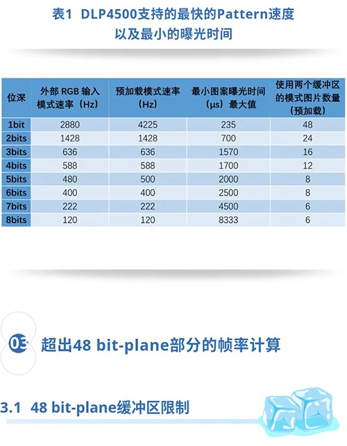 使用来自闪存的最多2个24位平面的模式序列可以达到最快的模式速率。 只要这样的序列组合总共≤48bit-plane,可以是 48个1bit模式,或6个8bit或任何此类模式组合,总计48bit-plane。在这种情况下,模式从闪存预先加载到DLPC350内部RAM,单个模式可以以最快的速率显示,与模式图片加载时间无关(在4225hz时为1位;在120hz时为8位;参见表1)。