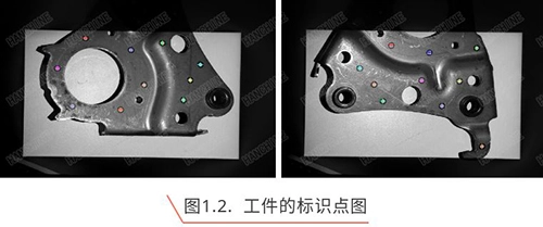 多视标签定位的前提是得到精确的特征标识点三维数据。具体做法是在物体表面贴特制的标识点,如黑底白圆高精度圆,不反光。标识点的数量至少需三点,不能出现多点共线的情况,根据三维物体的形状在曲率比较高的地方多贴点,以保证特征点区域完整表达物体的三维拓扑特征,然后根据每个测量位置至少可以看见三个不共线的标签的原则进行数据采集,如图1.1所示。