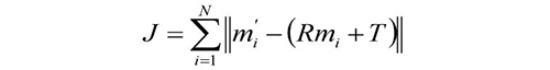 通过已经获得的匹配的特征标识点后,就可以根据这些特征标识点建立空间对应关系。可见,多视角数据匹配的问题关键在于不同视角下对应特征点集的选取和上述问题的求解。求取刚体运动的旋转矩阵R和平移矩阵T的方法主要有四元数法、最小二乘法、矩阵的奇异值分解法等。