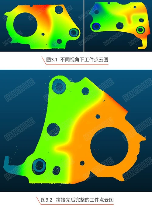 不同视角下得到工件点云图如图3.1所示,通过求得的RT矩阵,将不同坐标系下的点云转到同一坐标系下,得到拼接结果如图3.2所示。