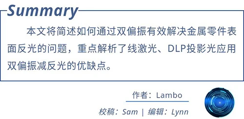最后,双偏振片减反光的缺点也比较明显,比较依赖结构光的高亮度,且比图像融合改善反光效果差,效果也因零件材质而异。但是应用在某些特殊场合来改善成像效果,成本低,方法简单,结果显而易见。