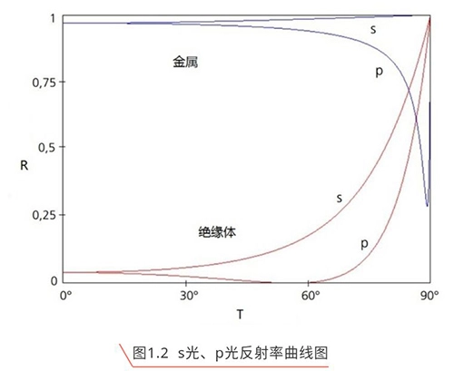 可以得到s和p的反射曲线图。(图1.2 为近似图,由于篇幅限制,不做具体数据和公式罗列。)纵轴为反射率,横轴为入射角,金属介质反光和非金属介质s、p反光率如下图。