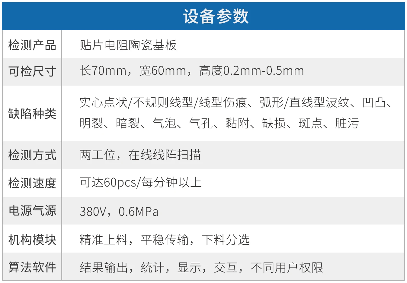 3、检测速度:可达60pcs/每分钟以上;4、深度学习融合传统算法,实现OK、返修、NG准确分类。